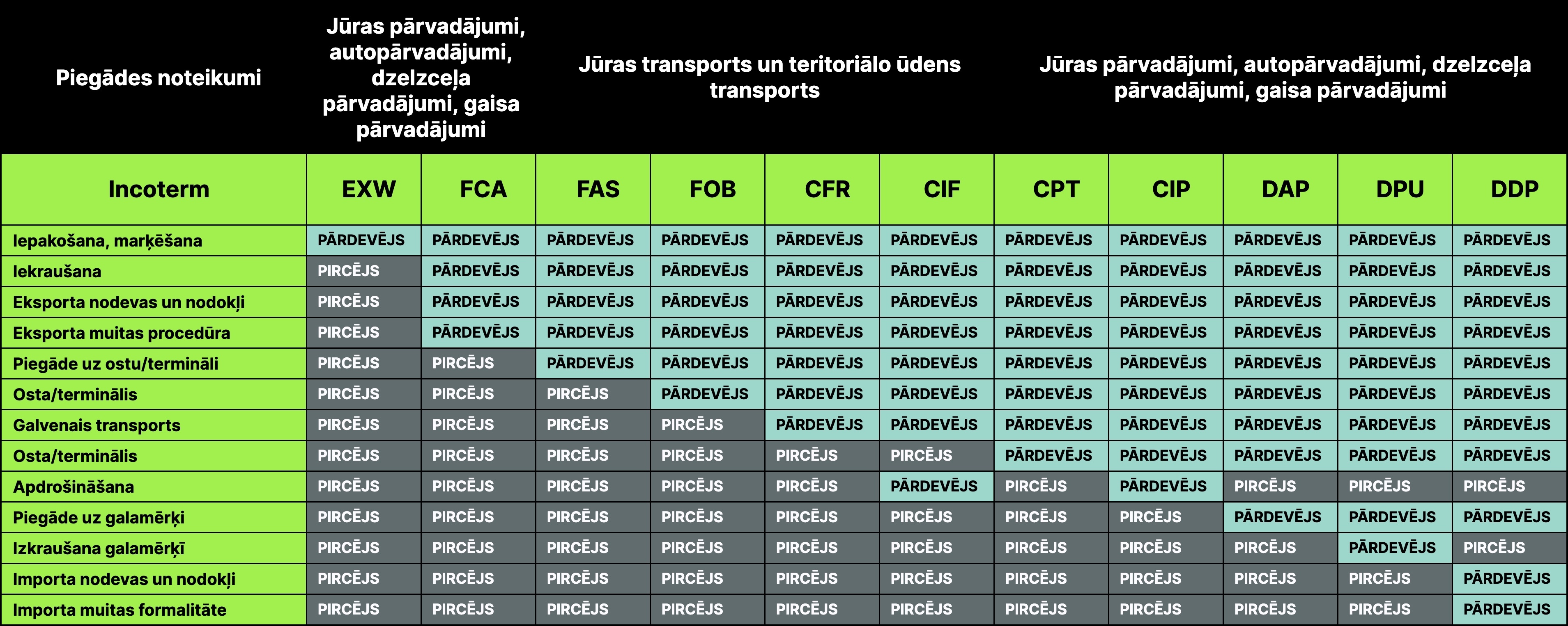 Incoterms noteikumos 7 no 11 terminiem attiecas uz pārvadājumiem visu veidu transportlīdzekļiem un 4 tikai uz jūras transportu un teritoriālo ūdens transportu: