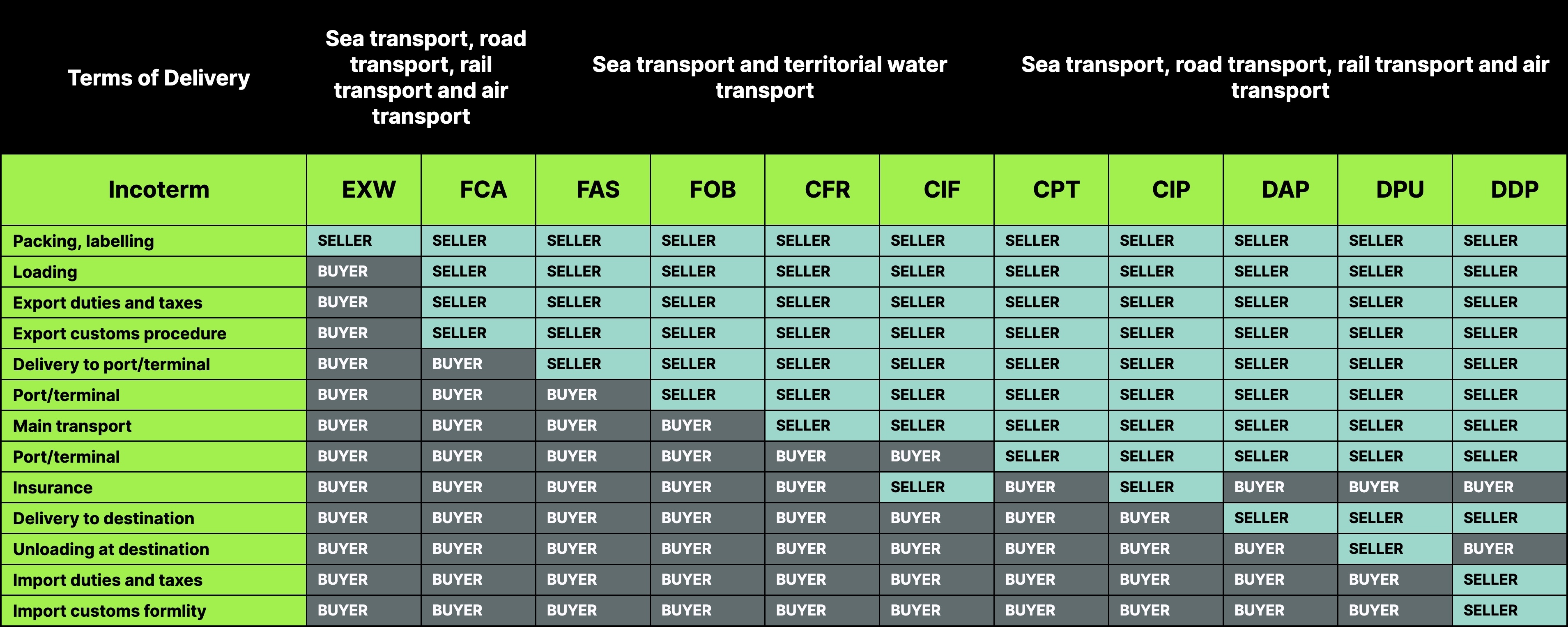 The Incoterms rules contain 11 terms that regulate the conditions of cargo transportation, risks and redistribution of delivery related costs between the seller and the buyer.